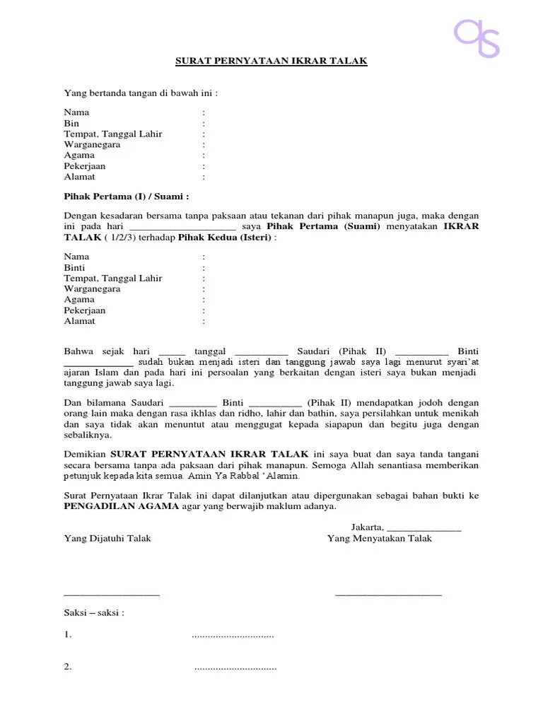 Yang bertanda tangan di bawah ini dengan kesadaran bersama, tanpa paksaan ataupun tekanan dari pihak lain, maka dengan ini saya pihak pertama (suami) memberikan ikrar talak 3 (tiga) kepada Surat lamaran kerja, surat pindah sekolah, surat pernyataan, surat perjanjian gadai, surat keterangan aktif mengajar, surat perjanjian kerjasama, surat pernyataan talak/cerai. Contoh surat pernyataan mulai dari perjanjian, diri, sekolah, kesalahan, kesanggupan, kerja, hutang, dan bahasa inggris, semoga bisa membantu. Lihat juga:tips menjaga keutuhan rumah tangga di era medsos. Nama tersebut di atas disebut sebagai pihak ke 1 ( satu ) ( suami)… thn saya pihak ke 1 (satu) (suami) telah menjatuhkan talak 1 (satu) kepada pihak ke ii (dua) (istri) demikianlah surat.